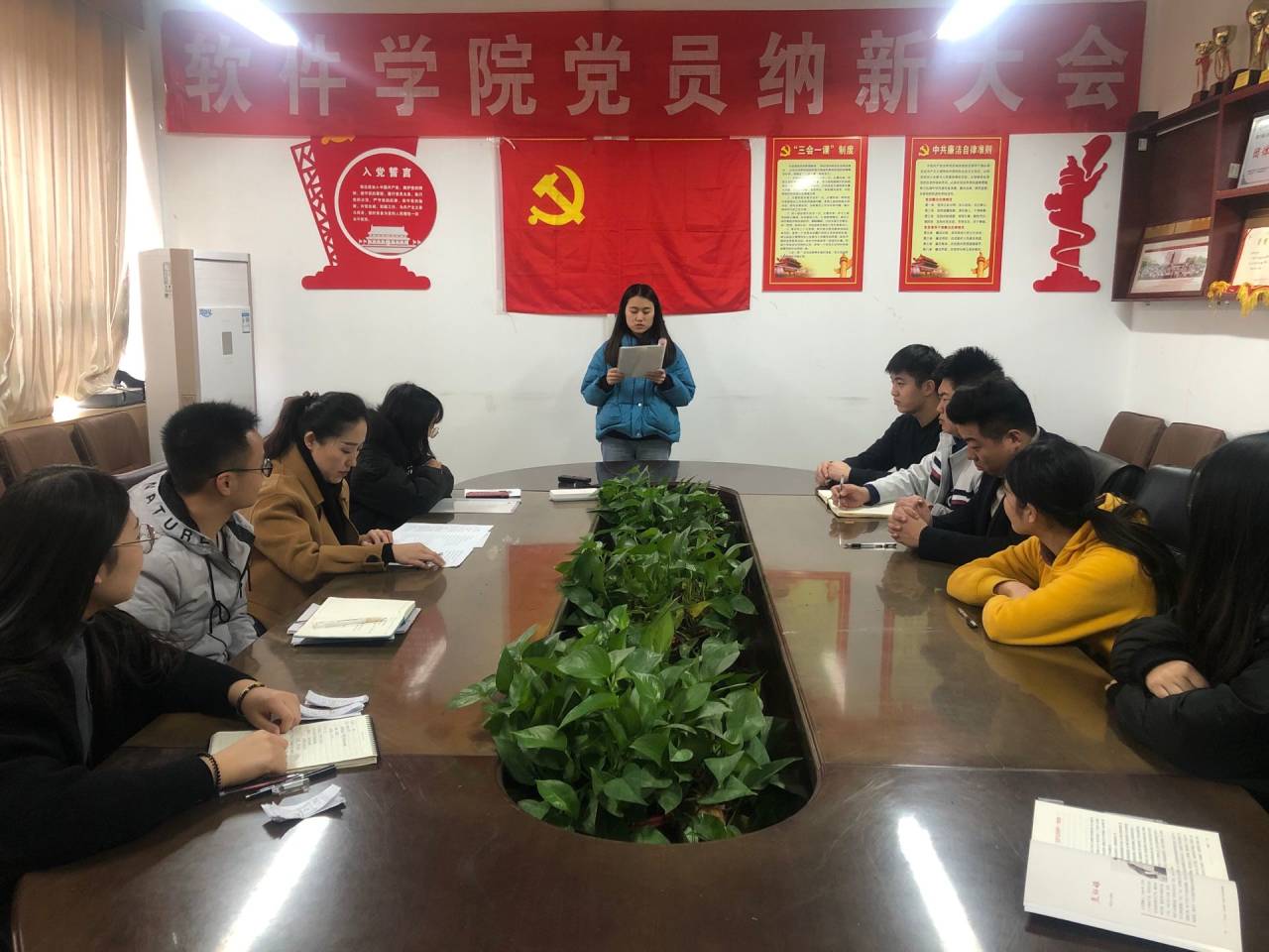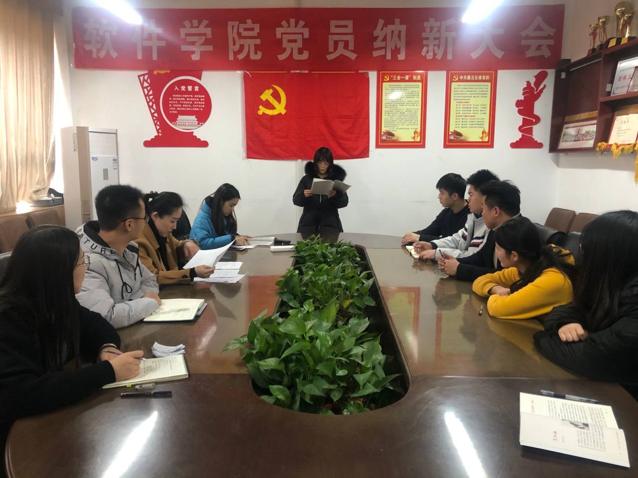 2019年12月9日下午三时许,软件学院研究生党支部召开党员纳新会议,本次会议由研究生党支部书记王抒同志主持,主要讨论贾惠、魏媛媛两名发展对象的情况,并讨论是否接受他们入党的问题。