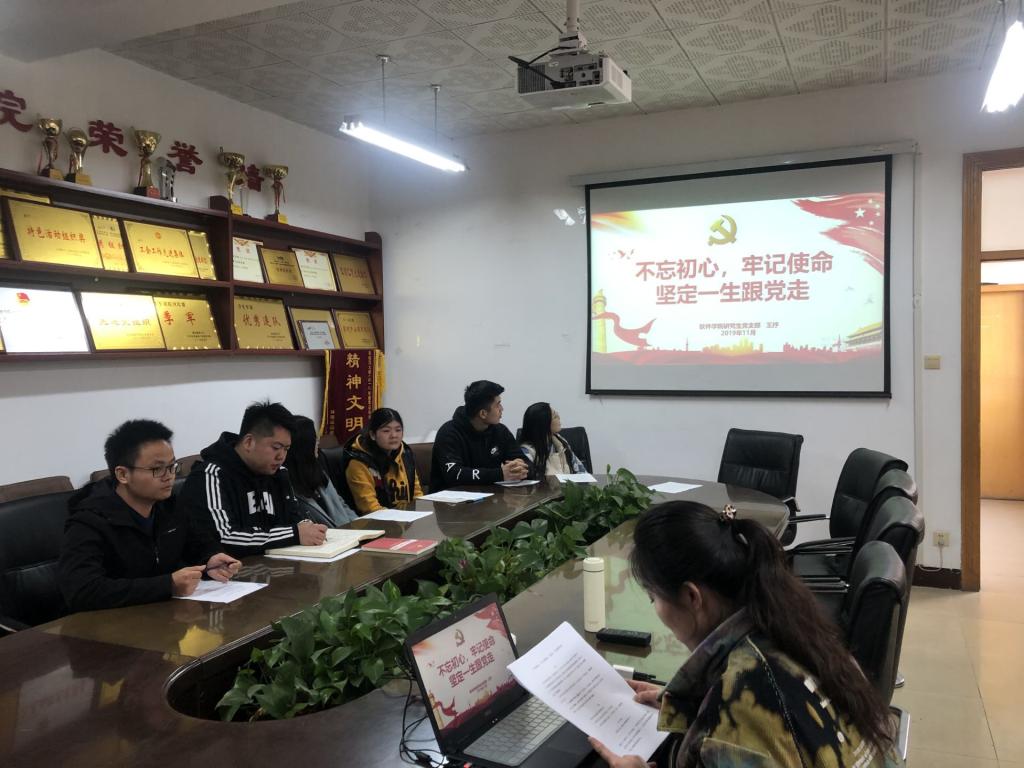 为贯彻落实习近平总书记的重要指示精神,组织引导党员干部以彻底的自我革命精神对照党章党规找差距,根据中央部署和省委要求,以及学校党委主题教育实施方案,2019年11月12日上午,软件学院研究生党支部举行“不忘初心、牢记使命”主题教育对照党章党规找差距专题会议,党支部书记王抒同志主持会议。