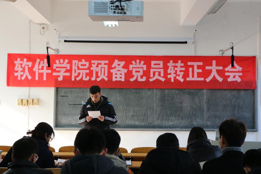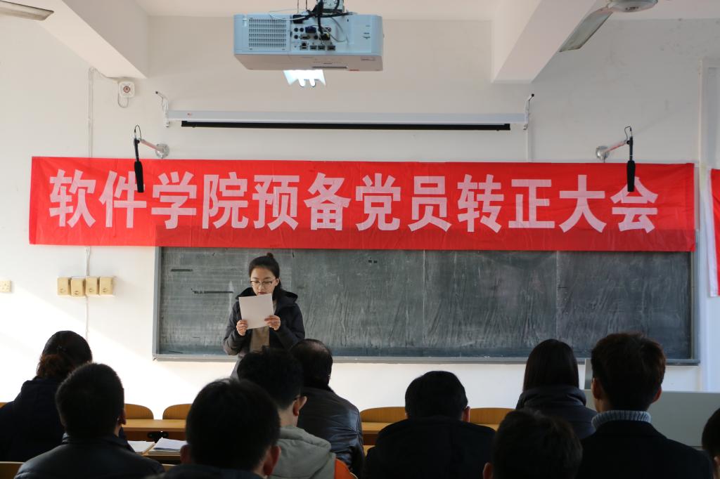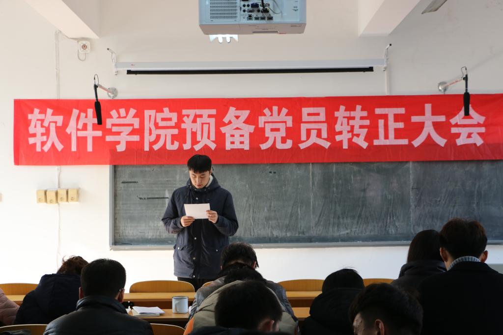 12月17日上午,软件学院本科生党支部在体育教学部228教室召开预备党员转正大会,软件学院本科生党支部全体党员参加会议,软件学院党委副书记、本科生党支部书记田凯主持会议。