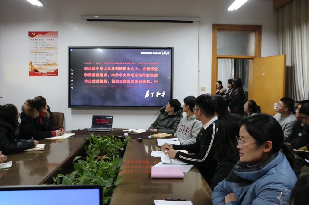 召开“为了和平 --学习抗美援朝精神”主题党日活动,团委书记范瑞红、辅导员洪亚玲、武玉龙、丁允念参加会议。