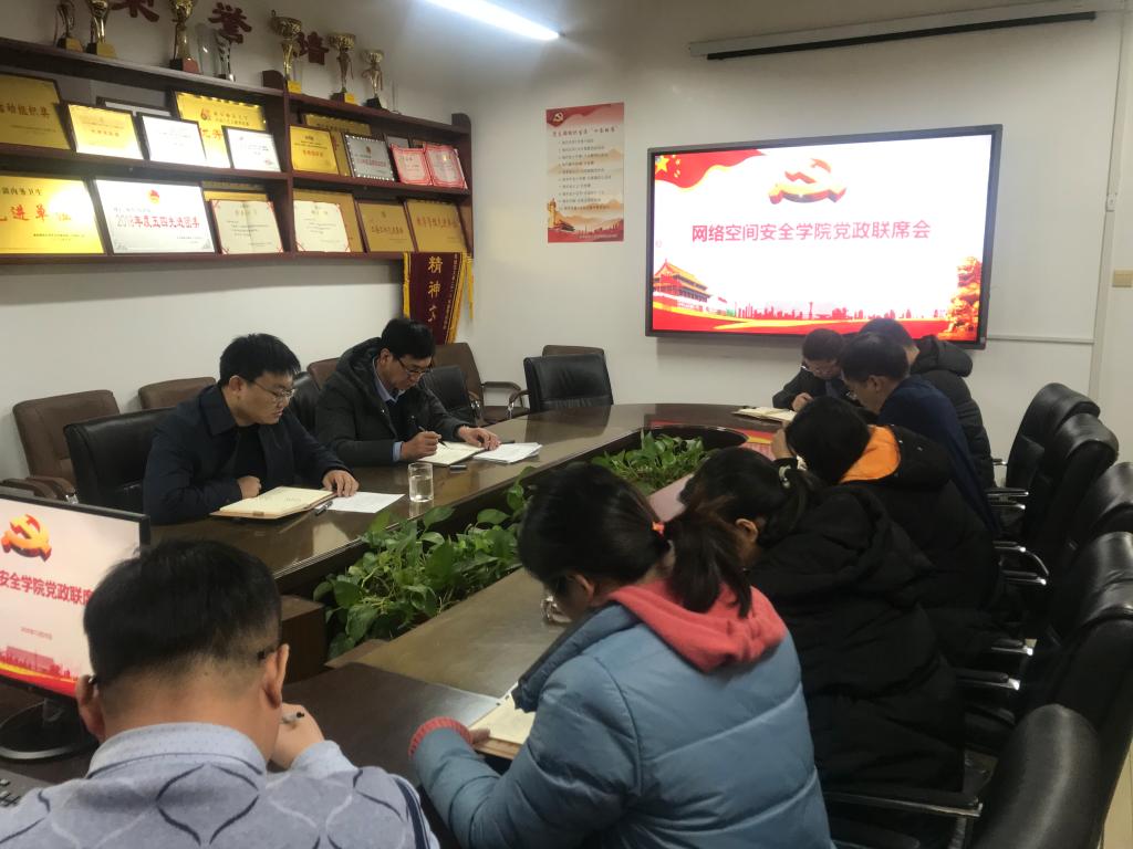 络空间安全学院院讯(通讯员:范瑞红)12月28日下午,学院召开党政联席会议,研究布置重点工作。学院党政领导班子成员、系主任、办公室、教务、学团等人员参加会议。