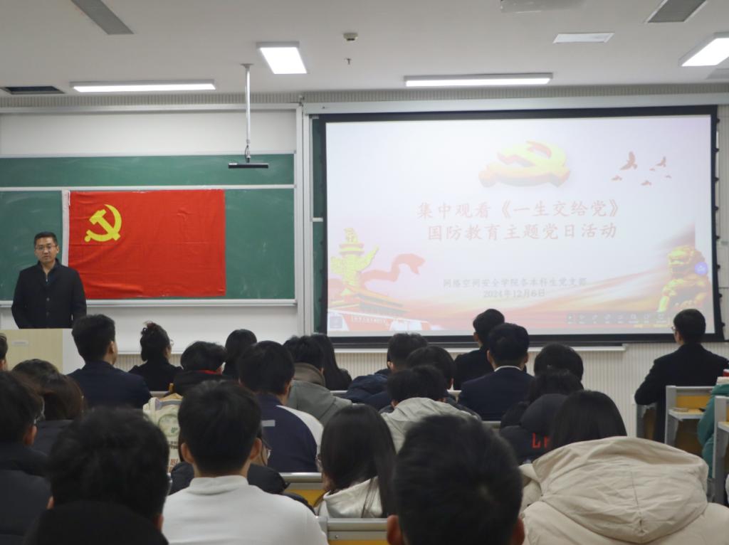 各本科生党支部于格物楼B107开展国防教育主题党日活动,集中观看国防教育主题电影《一生交给党》。党委副书记范瑞红、本科生第一党支部书记武玉龙、本科生第二党支部书记丁允念、本科生第三党支部书记于媚媛、辅导员相青、洪亚玲、赵兴卯以及本科生党员参加本次主题党日活动。