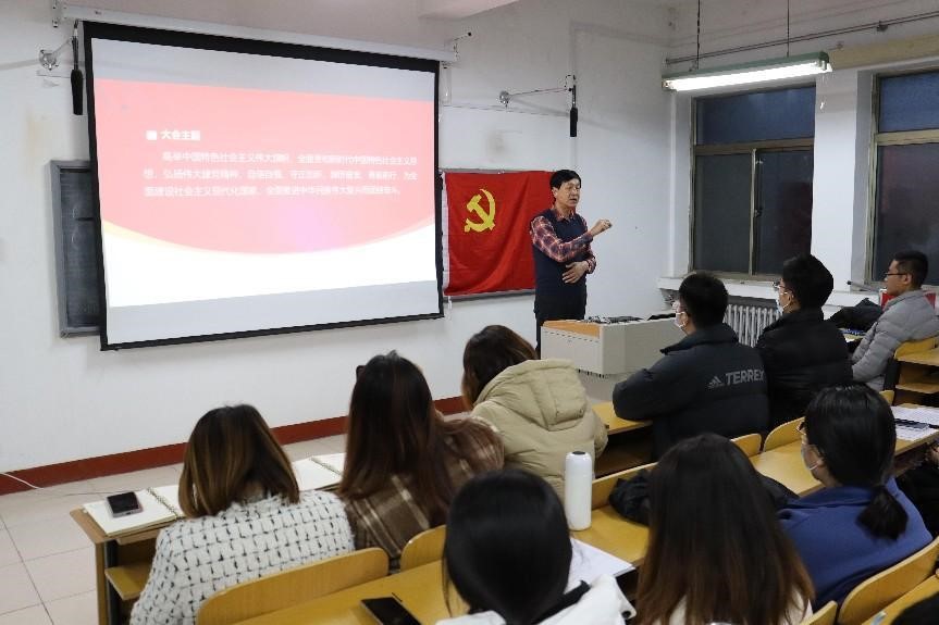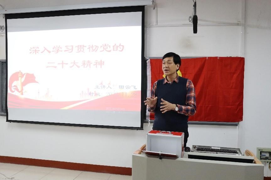 本科生党支部深入学习贯彻党的二十大精神主题党课于体育教学部228教室召开。学院党委书记田云飞担任主讲人,党委副书记范瑞红,本科生党支部全体教师党员和学生党员参加会议。