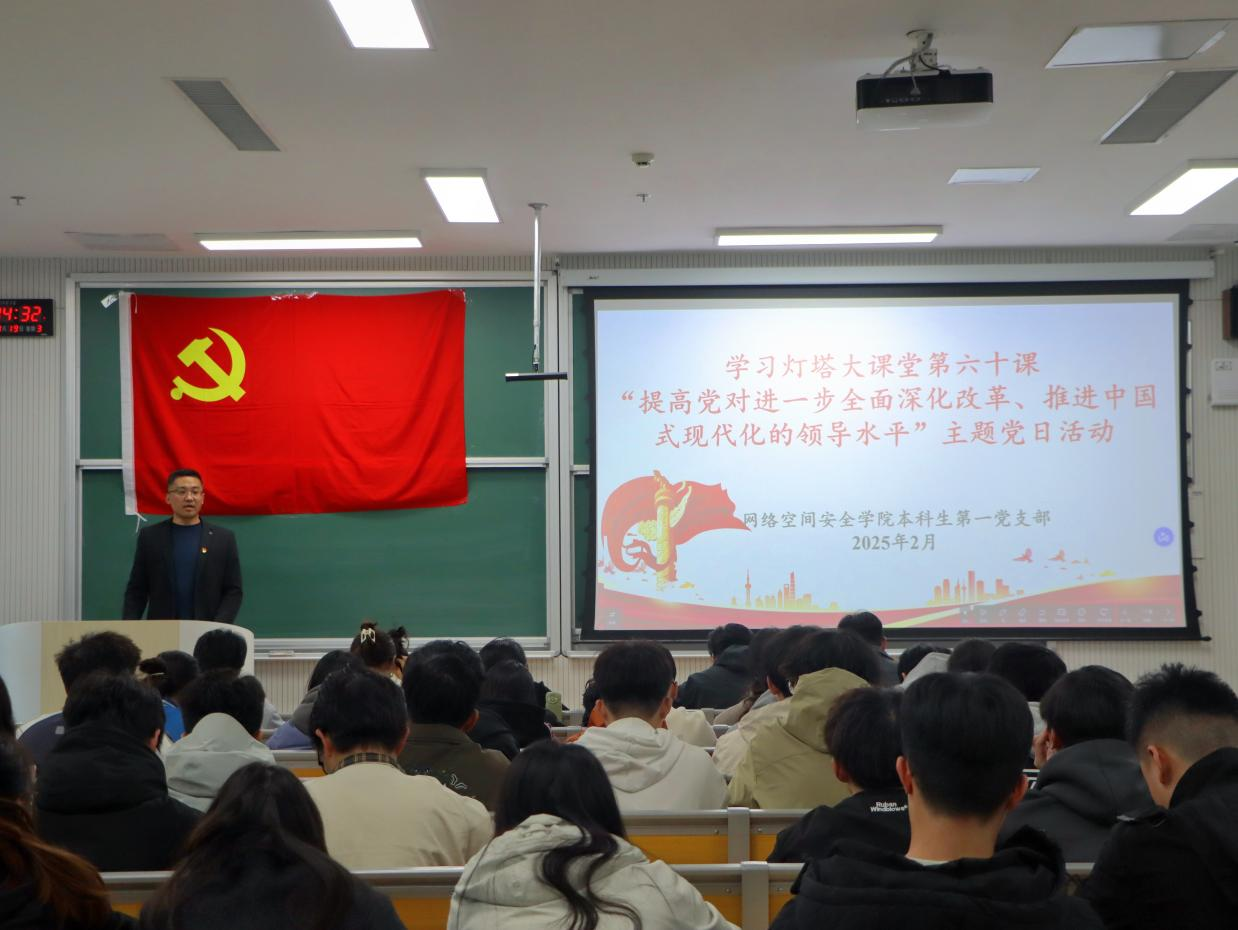 本科生各党支部书记带领支部党员深入学习贯彻第二十八次全国高校党的建设工作会议精神:要以“两个维护”为最高政治原则,全面贯彻党的教育方针,为加快建设教育强国、网络强国提供坚实支撑。各支部党员分别观看了《灯塔大课堂》第六十课专题片,深入学习“提高党对进一步全面深化改革,推进中国式现代化的领导水平”相关内容。各支部书记对全面深化改革进行了强调,明确改革是决定当代中国命运的关键一招,学院发展必须主动融入国家改革大局,以党建引领技术攻关与人才培养;要求将政治建设摆在首位,以党的领导贯穿学院治理各环节,引领学院高质量发展。