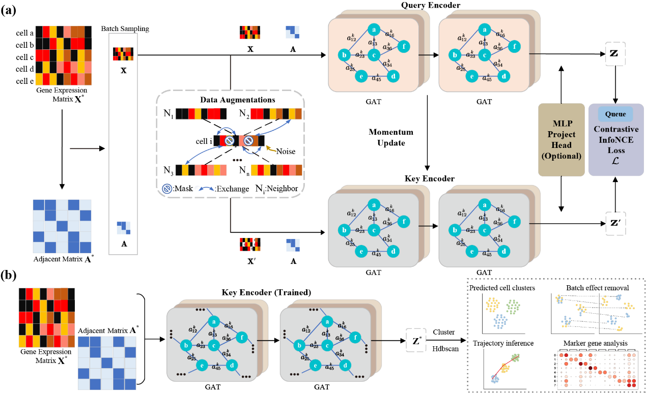 在scRNA-seq数据分析中,细胞聚类是下游分析的关键步骤,因为它使我们能够识别细胞类型并发现新的细胞亚型。然而,scRNA-seq数据的特性,如高维度、稀疏性、dropout事件和批次效应,为聚类分析带来了显著的计算挑战。在本研究中,我们提出了scGCC,一种新颖的图自监督对比学习模型,以解决scRNA-seq数据分析中面临的挑战。scGCC包括两个主要组件:表示学习模块和聚类模块。首先,将scRNA-seq数据输入表示学习模块进行训练,然后通过聚类模块进行数据分类。scGCC可以学习低维去噪嵌入,这对我们的聚类任务非常有优势。我们引入了图注意力网络(GAT)进行细胞表示学习,从而实现更好的特征提取和提高聚类准确性。此外,我们提出了五种数据增强方法,通过增加数据多样性和减少过拟合来提高聚类性能。这些方法增强了聚类结果的鲁棒性。我们对14个真实世界数据集进行了实验研究,结果表明我们的模型在准确性和鲁棒性方面表现出色。我们还进行了下游任务,包括批次效应去除、轨迹推断和标记基因分析,以验证我们模型的生物学有效性。