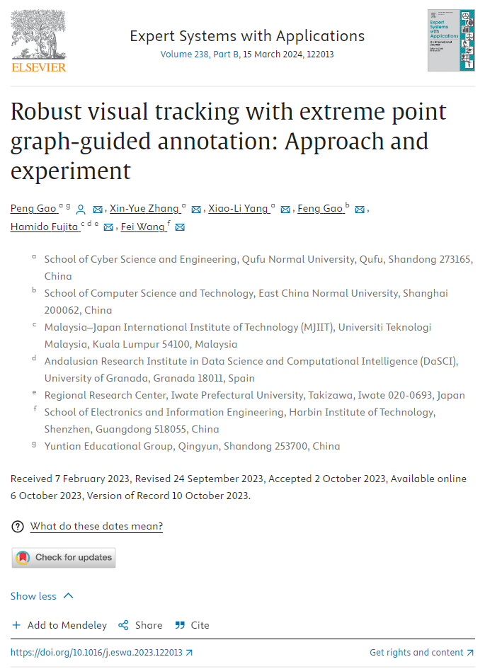 学术论文(Peng Gao, Xin-Yue Zhang, Xiao-Li Yang, Feng Gao, Hamido Fujita, and Fei Wang. Robust Visual Tracking with Extreme Point Graph-Guided Annotation: Approach and Experiment, 2023)。该论文以曲阜师范大学91探花
