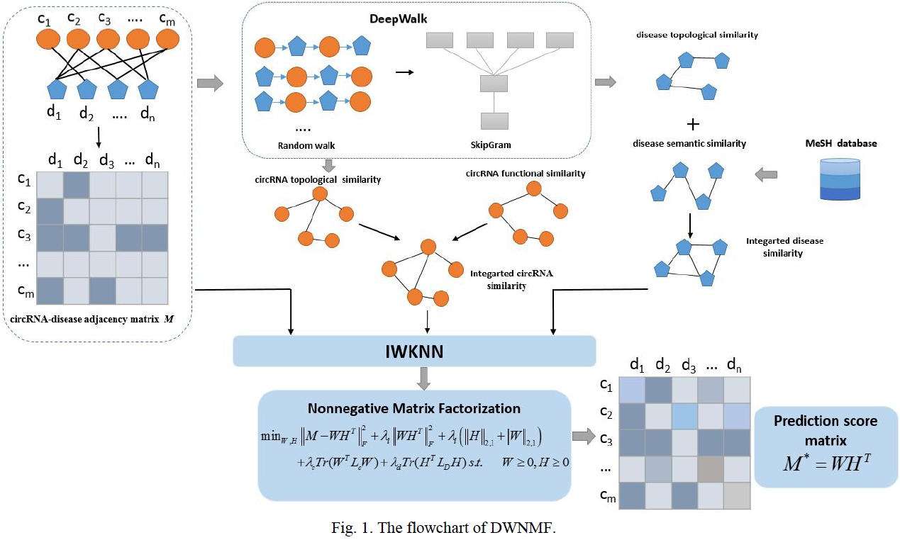 论文提出了一种基于DeepWalk和非负矩阵分解的新方法用于预测circRNA-疾病的关联。基于已知的circRNA-疾病关联,通过DeepWalk方法计算circRNA和疾病之间的拓扑相似性,从而学习关联网络上的节点特征。并进一步将circRNAs的功能相似性和疾病的语义相似性与它们各自不同尺度的拓扑相似性融合在一起。然后,使用改进的加权K最近邻方法对circRNA-疾病关联网络进行预处理。最后,引入L2,1-范数、双图正则化项和Frobenius范数正则化项到非负矩阵分解模型中,以预测circRNA-疾病的相关性。在circR2Disease、circRNADisease和MNDR上进行了的交叉验证结果表明,所提出的方法能够准确预测潜在的circRNA-疾病关联。