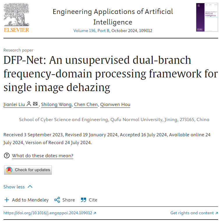 学术论文(Jianlei Liu, Shilong Wang, Chen Chen, Qianwen Hou. DFP-Net: An Unsupervised Dual-Branch Frequency-Fomain Processing Framework for Single Image Dehazing, 2024)。该论文以91探花