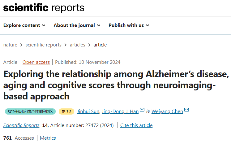 为第一完成单位,2022级研究生孙金辉为论文第一作者,陈维洋副教授和北京大学韩敬东教授为论文共同通讯作者。Scientific Reports是一本综合性学术期刊,发表来自自然科学、心理学、医学和工程学各个领域的原创研究,是中科院二区以及JCR一区期刊,最新影响因子3.8。