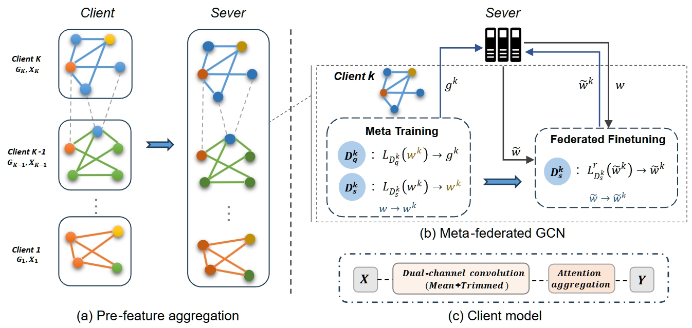 图神经网络(GNN)在数据挖掘和推荐系统等基于图的节点分类任务中非常有效,将联邦学习与GNN结合,使得多个参与者能够在不共享隐私数据的情况下协同训练强大的模型。然而,子图级别的联邦学习面临跨客户端边丢失和非独立同分布数据分布等挑战,在非完全信任的环境中确保安全性也是一个关键问题。为此,论文提出了RMFGL(鲁棒元联邦图学习),通过预特征聚合集成跨客户端信息,并利用模型无关的元学习来优化元参数,从而实现最小化的联邦更新。同时采用了具有双通道注意力聚合的GCN架构增强鲁棒性,并使用多密钥全同态加密来确保训练过程中的隐私安全。通过在多个数据集上的实验分析,RMFGL相比基准方法实现了准确度的显著提升,且相比最先进的技术有更好的表现,增强了对恶意客户端的鲁棒性,同时在非IID数据下依然保持强大的性能。