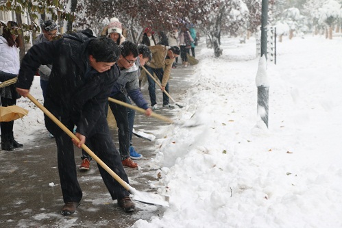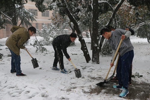 虽然天空中飘着雪花,天气寒冷,积雪较厚,师生们的劳动热情却不减分毫。铁锹翻飞,扫帚舞动,大家齐心协力清除着校园里的积雪,虽然大家的手和脸被冻红,头发和衣服被浸湿、结冰,但大家依然干劲十足,充满热情,享受着团结劳动的快乐。期间,校党委书记荆兆勋、校长戚万学等领导前来慰问老师与同学,对大家的工作表示肯定。面对鼓舞,大家热情高涨,经过一下午的奋战,校园内主干道及人行道上的积雪得以清除。