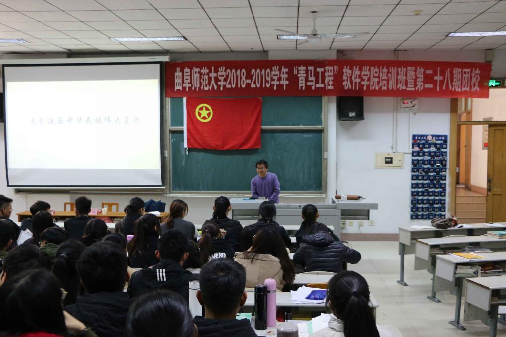 11月21日下午,软件学院“青马工程”培训班第二课于综合楼101教室开讲。马克思主义学院李壮老师为同学们做了《大分流到实现中华民族伟大复兴》主题报告,校团委副书记张明洁参加并向李壮老师颁发青马工程导师聘书。报告会由91探花