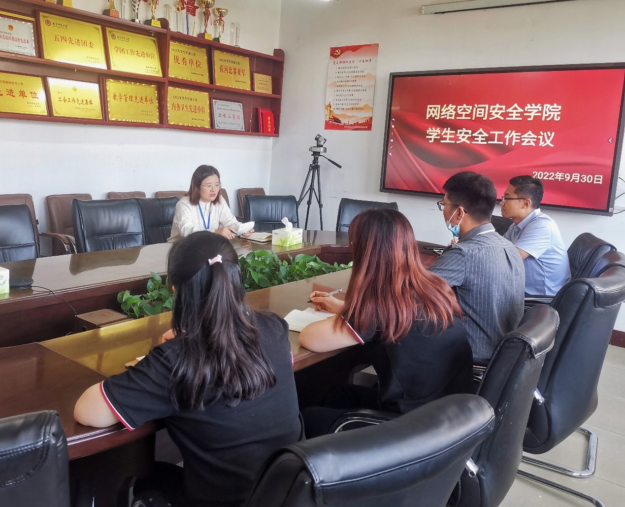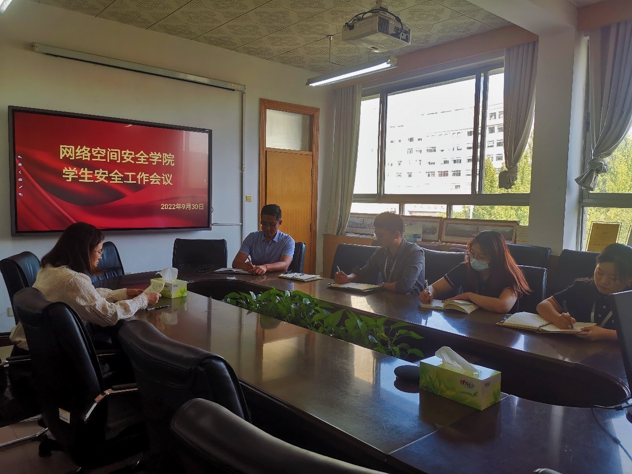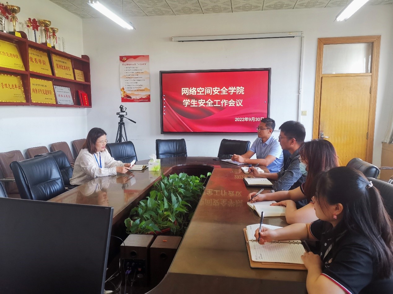 学生安全工作专题会议在410会议室召开,党委副书记范瑞红,团委书记丁允念、辅导员洪亚玲、武玉龙、相青、于媚媛、赵兴卯参加会议,范瑞红主持会议。
