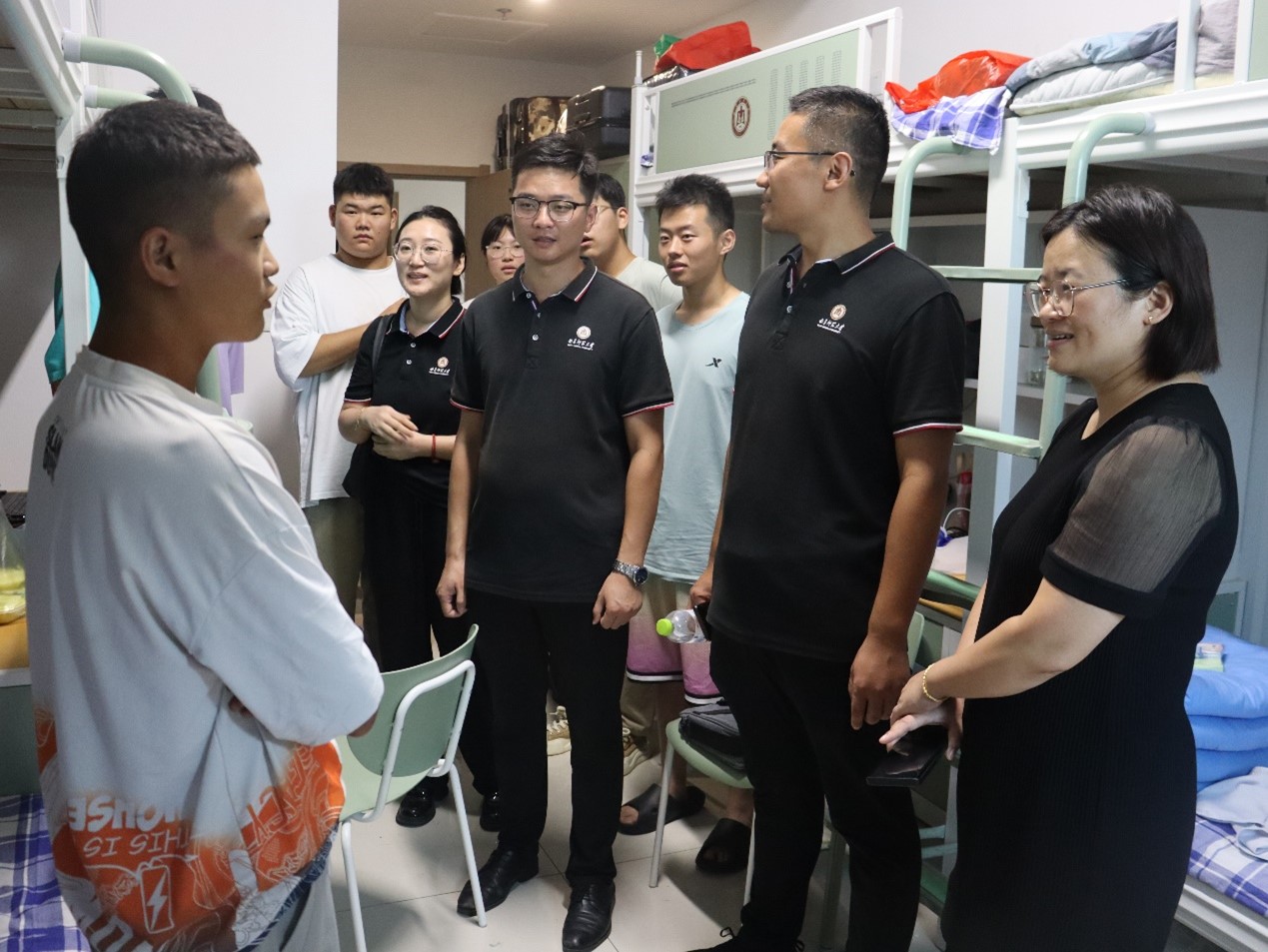 学院党委副书记范瑞红、团委书记丁允念、辅导员武玉龙、于媚媛走访新生宿舍,认真听取学生需求,切实解决问题,并向新生们开启人生新旅程表示祝贺,鼓励新生用心感受曲园氛围,科学规划大学生活,为全面成长成才打下坚实基础。