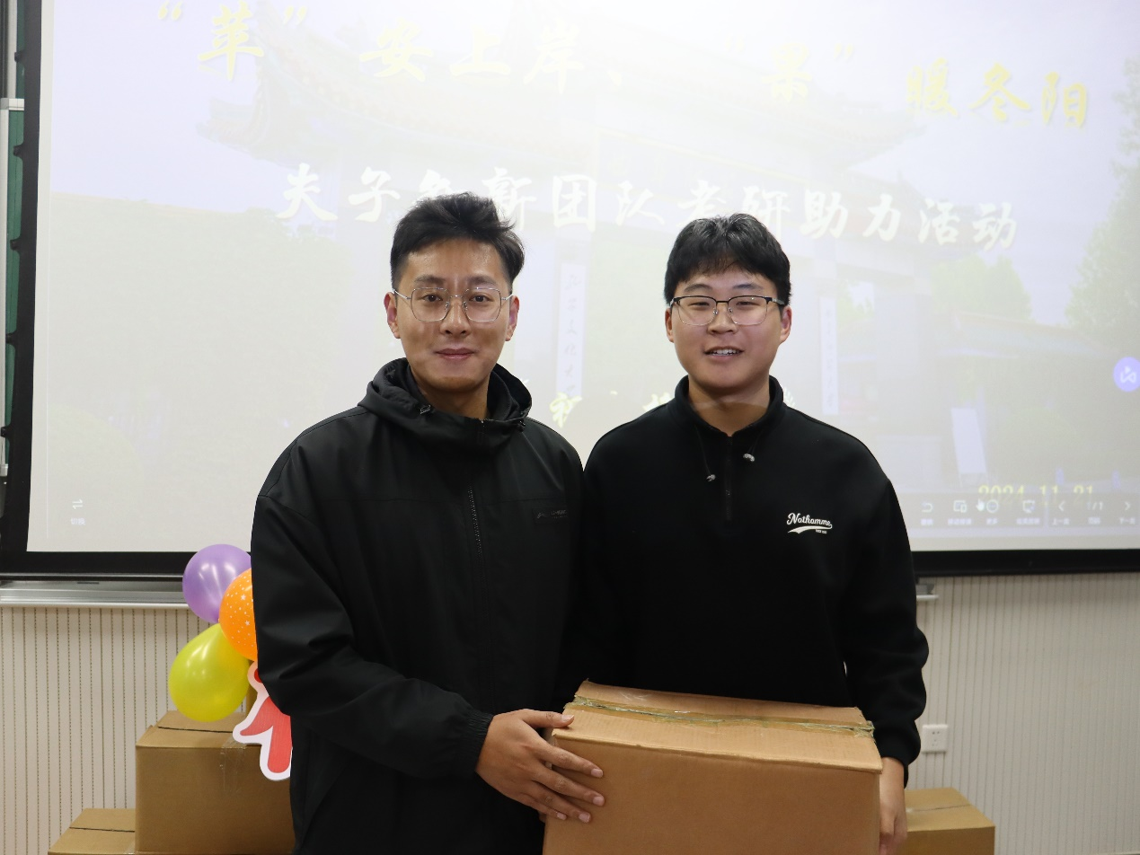 本次活动由夫子知新团队鼎力支持。活动伊始,周子力向同学们介绍了夫子知新平台,并表达了对考研学子的深切关怀与诚挚鼓励。他勉励大家在考研路上坚定信念、全力以赴,这一席话极大地提振了同学们的斗志与信心。随后,周子力老师和辅导员老师共同为考研学子送上寓意“‘苹’安上岸”的苹果礼盒。这份承载着祝福的礼物,不仅体现了学院对学生深切的关怀之情,也为考研路上的学子们平添了一抹温情与鼓舞人心的力量。最后,辅导员老师与考研学子亲切合影留念,用照片记录下这份温馨与鼓励,也为大家注入了必胜的信心与勇气。