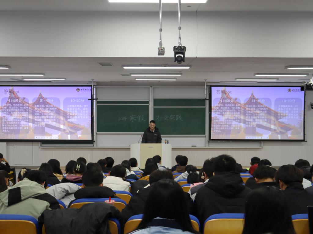 2024年寒假社会实践宣讲会于致知楼B101、B102顺利举办。学院团委学生会就业实践部部长李芳威和副部长钱阳、宫苏恒担任主讲人,2024级全体学生参与本次宣讲会。