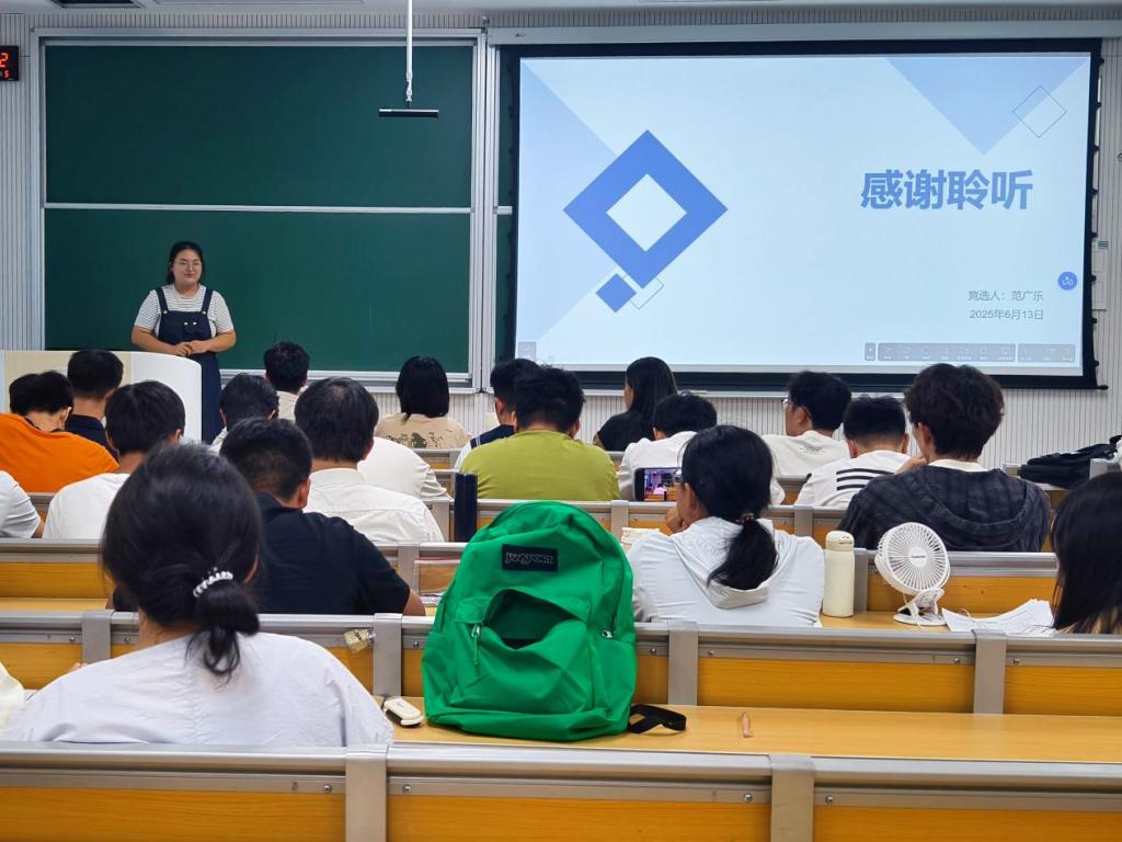 本次换届竞选包括竞聘演讲与现场问答两个环节。竞选者依次登台,围绕个人能力、岗位理解和未来规划展开陈述。他们结合实际工作经历,或展示沟通协调与资源整合能力,或提出优化考核机制、搭建交流平台等务实举措,彰显出创新意识与担当精神。答辩环节,面对评委关于活动策划构思、资源统筹分配及突发状况处置等方面提问,竞选者以清晰的思路框架与全面的素质能力从容应答,思路清晰,展现出良好的逻辑思维和综合素质,赢得评委的一致认可。