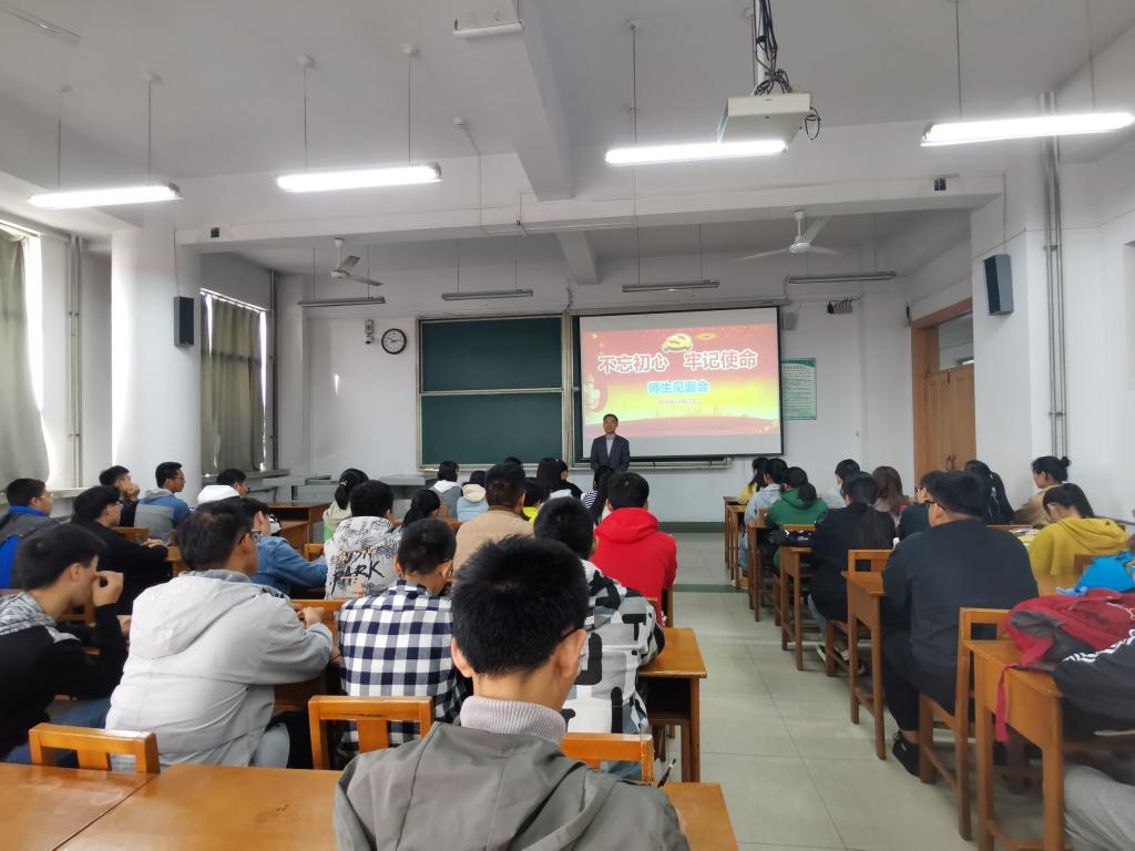 后勤管理处党委书记冀贞友联系2019级软件工程1班。冀书记首先向同学们讲解学校后勤管理的发展与规划,并对多发的安全教育问题做出详细的解答,告诫同学们注意保护自身安全和人身财产安全。不忘初心,牢记使命,加强学科建设也是冀书记反复强调的重点,他希望同学们能够早日投身到中华民族的伟大复兴建设当中,为国家做贡献。