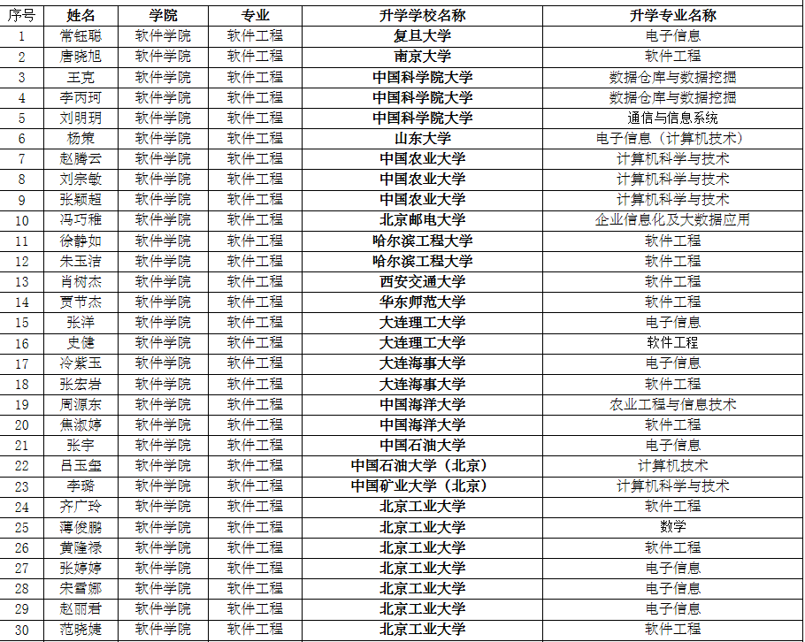 今年考研成绩突出,有近80人被985、211名校录取。其中,常钰聪被复旦大学录取,唐晓旭被南京大学录取,王克、李丙珂、刘明玥3人被中国科学院大学录取,杨策被山东大学录取,赵腾云、刘宗敏、张颖超3人被中国农业大学录取,冯巧稚被北京邮电大学录取,徐静如、朱玉洁2人被哈尔滨工业大学录取等等。