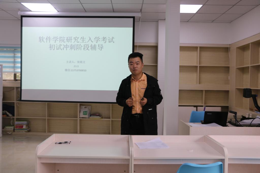 张铭文为同学们作了主题为“软件学院研究生入学考试初试冲刺阶段指导”的精彩报告。讲座伊始,他为同学们的考研复习做了一个整体安排,与同学们沟通后,他纠正了同学们在复习过程中的常见误区。同时,他强调在复习过程中一定要保持积极向上的心态,并建议大家根据各个科目的特点制定不同的复习方法和学习计划。最后,他分享了一些自身行之有效的复习方法,告诫同学们要劳逸结合,持之以恒,厚积薄发。田凯书记结合自身经历以及多个事例为同学们讲述了在备考期间遇到困难的解决方法,使大家收益颇深。在同学们热烈的掌声中,本次讲座圆满结束。