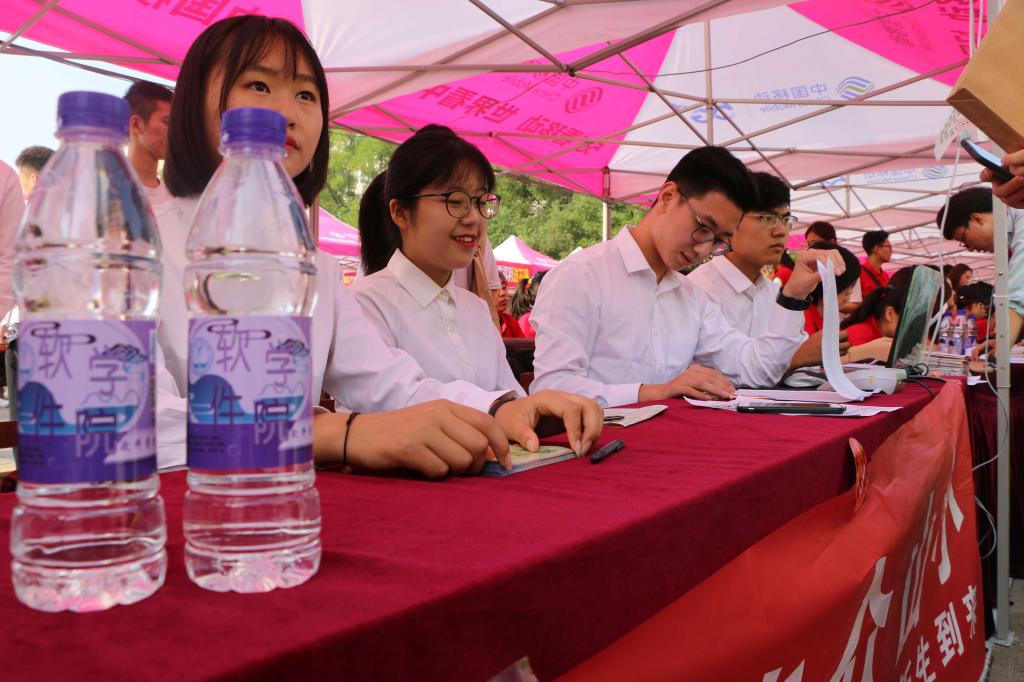 软件学院党委书记田云飞,党委副书记田凯,副院长倪建成,团委书记范瑞红,辅导员郑凤华、洪亚玲莅临现场,指挥协调迎新工作。本次迎新中,软件学院以“会当0绝顶,1览众山小”为迎新标语展现了学院专业的特色,为学子们开启了0和1组成的代码世界的大门。“瓶”水相逢,一纸传情。一瓶水,使舟车劳顿的家长们第一时间体验到学院的温情厚谊。一份“启航”院报,可以了解软件学院的成绩与荣耀。在紧张忙碌的迎新工作中,为确保新生顺利办理各项手续,快速适应大学生活,志愿者们热情细致,现场报到工作开展的快速高效,井然有序,赢得了新生及家长的一致好评,充分展现了软件学院积极向上的精神面貌。