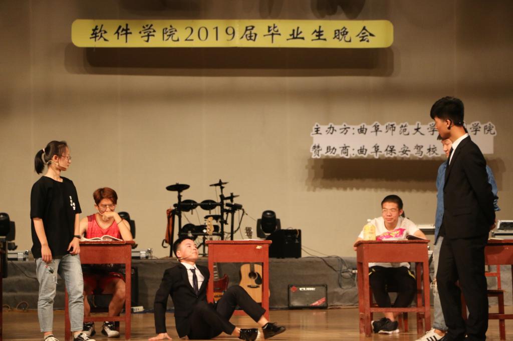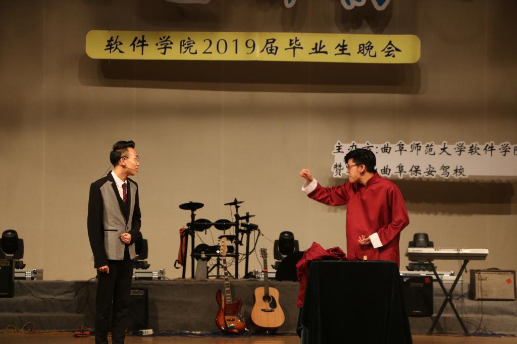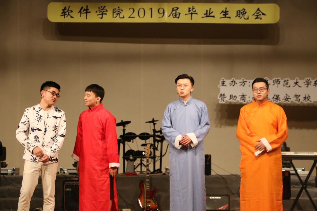“ 如果来生还能遇见你,我会紧紧拥抱你在怀里”,安治全同学深情演唱,唱出了对2019届毕业生的不舍。梁吉康等人带来的小品《上学那些事》生动的演绎了调皮捣蛋的学生们与谆谆教导的老师之间的故事,令人捧腹大笑的故事情节冲淡了毕业的感伤,让人不禁回忆起自己大学的点点滴滴。2015级张新宇同学搭档孙祎童、安治全、郑理想三位同学出演相声《找搭档》,形式新颖,幽默风趣的表演中道出了师弟师妹们对老学长的不舍与祝愿。张静一曲《推开世界的门》回忆往昔、展望未来。晚会在郑凤华老师携15级毕业生演唱的《再见》中完美落幕。