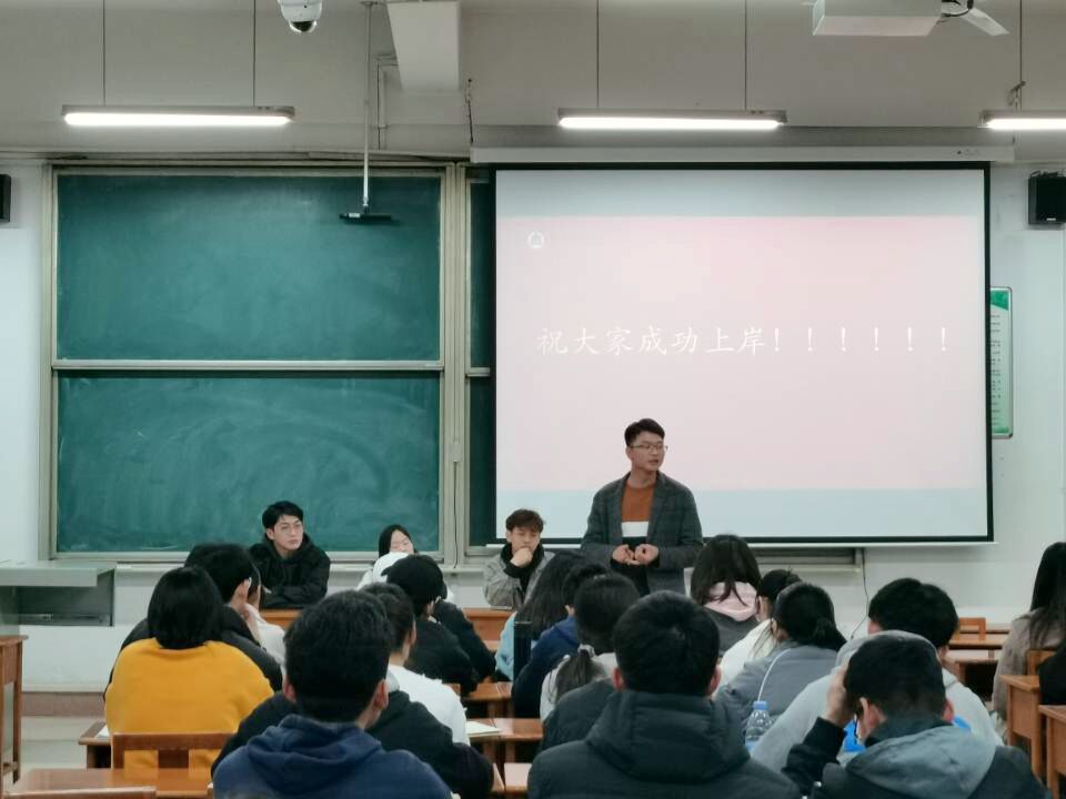 在综合教学楼205举办考研复试经验交流座谈会,毕业生辅导员丁允念老师、研究生桑洪川、卢星辰、范憧憧进行指导,90多名考研同学积极参与。