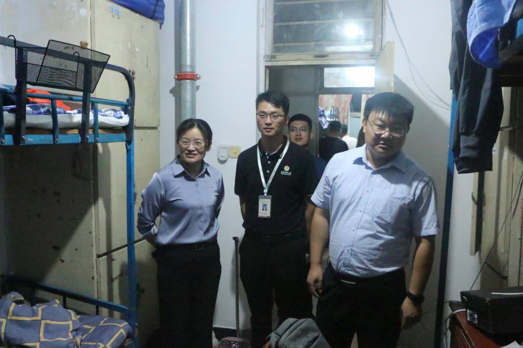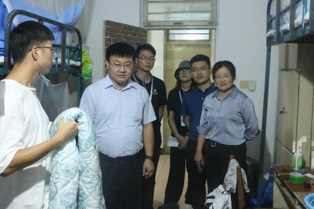 院长王茂励,党委副书记范瑞红,辅导员丁允念,李扬,于媚媛走访宿舍,关心慰问新生。
