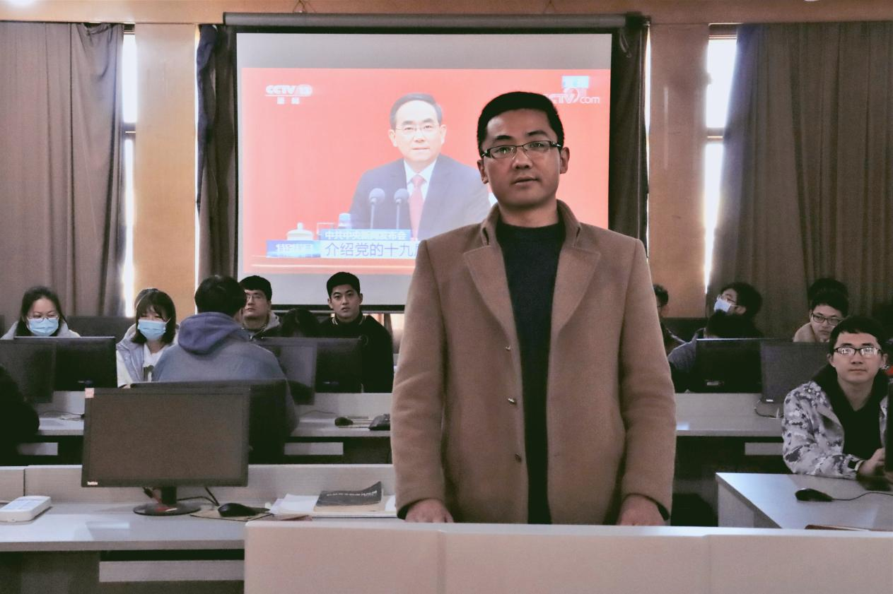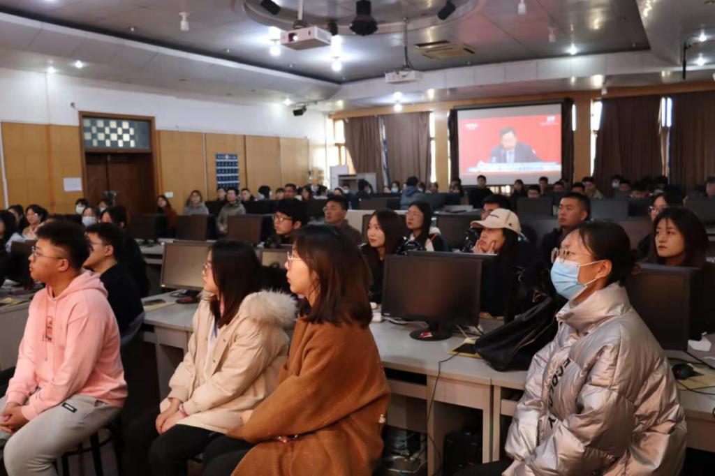 于502教室集中进行线上直播观看学习,本科生党支部书记武玉龙、研究生党支部书记高鹏以及本科生党支部、研究生党支部全体党员参加本次会议。