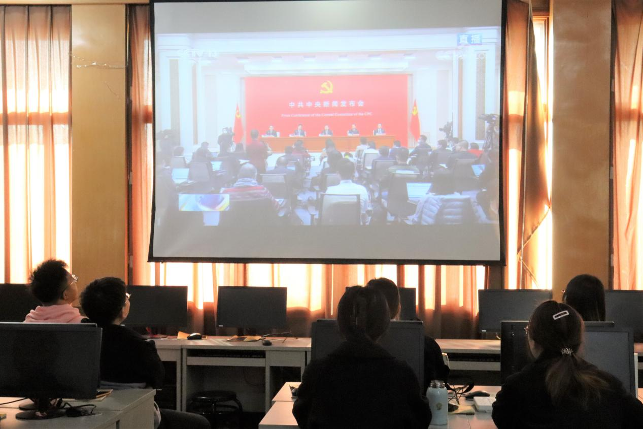 直播开始前,武玉龙向全体学生党员简略介绍了本次会议的内容。新闻发布会上,中央宣传部副部长、国务院新闻办主任徐麟主持发布会,中央宣传部分管日常工作的副部长王晓晖介绍了党的十九届中央委员会第六次全体会议的相关情况,并与中央政策研究室主任江金权、中央财经委员会办公室分管日常工作的副主任韩文秀、中央党史和文献研究院院长曲青山对十九届六中全会的精神做了更深层次的阐释。