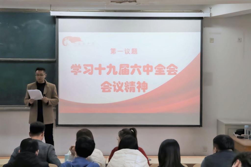 本科生支部党员大会“第一议题”学习了党的十九届六中全会精神,武玉龙向全体党员传达了十九届六中全会精神内涵,分享了党中央总结的党的百年奋斗重大成就和历史经验,深刻把握、学深悟透习近平总书记重要讲话精神和《决议》的丰富内涵、精神实质。武玉龙强调,党员同志必须在学习贯彻上走在前、作表率,以高度的政治自觉学习好宣传好贯彻好十九届六中全会精神,切实用以武装头脑、指导实践、推动工作,用实际行动贯彻学习党的十九届六中全会精神。