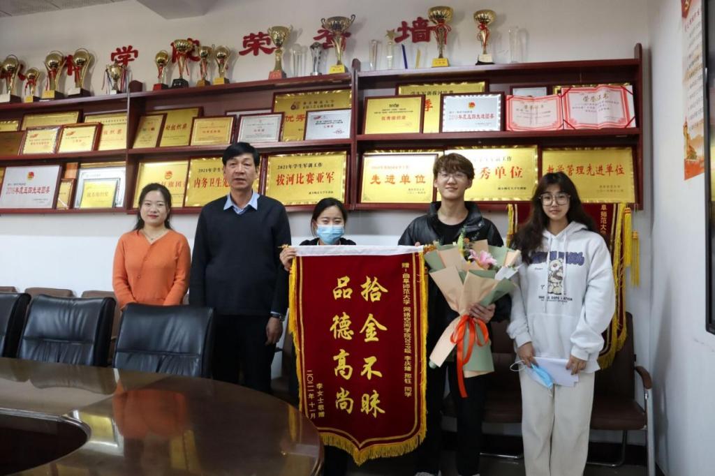 学生李庆绪与邢钰两位同学送来锦旗,并对两位同学拾金不昧的高尚品德提出赞扬,同时也对两位同学能够将手机物归原主的行为表示由衷的感谢。党委书记田云飞、辅导员洪亚玲对两位同学拾金不昧的行为予以充分肯定,并鼓励这两位同学继续发扬拾金不昧的精神,弘扬社会正能量。