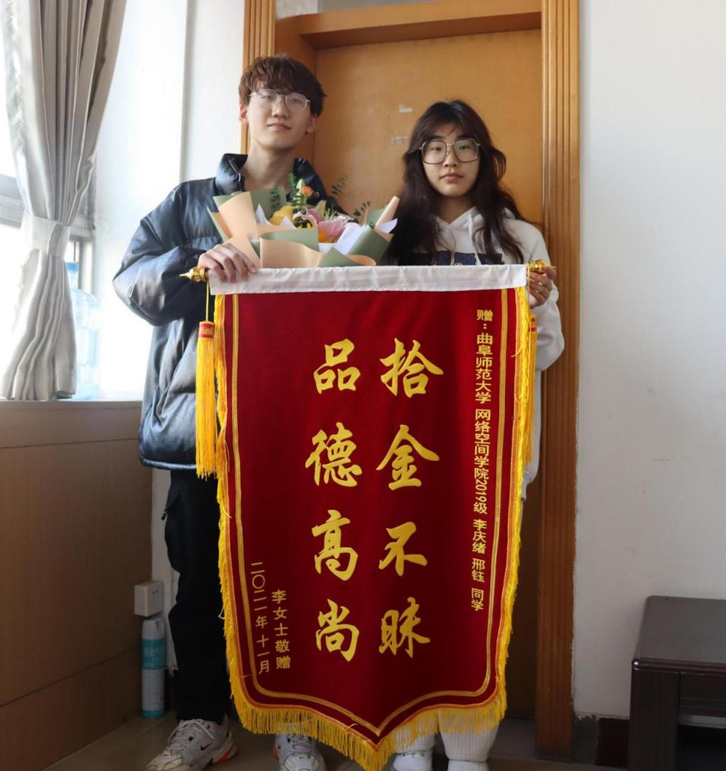 经了解,2021年11月21日晚上,李庆绪和邢钰两位同学在曲阜市蓝海影城附近捡到了苹果手机一部。该手机市场价值九千余元,李庆绪与邢钰捡到手机后,不为钱财所动,第一时间想到的是失主发现手机丢失后的焦急心情,便等待失主返回寻找。最终李女士打来电话,两名同学与失主李女士取得联系,将手机物归原主。就有了上面的一幕,社会人士李女士专程来到91探花