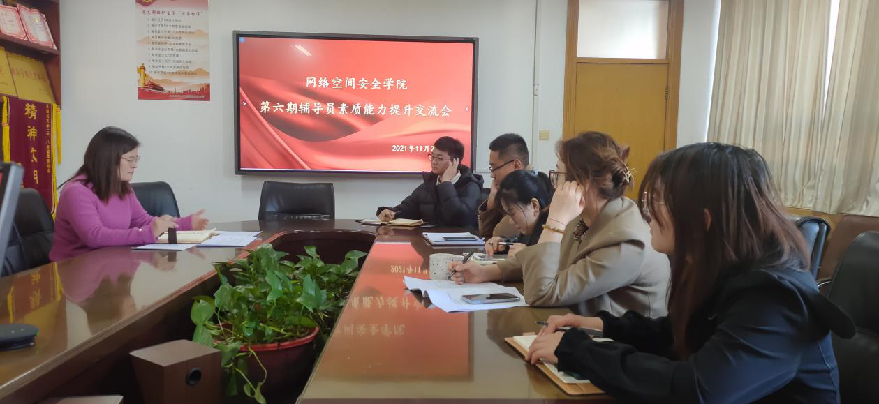 第六期辅导员素质能力提升交流会在410会议室举行,学院党委副书记范瑞红,辅导员洪亚玲、武玉龙、丁允念、相青、于媚媛参加学习交流。