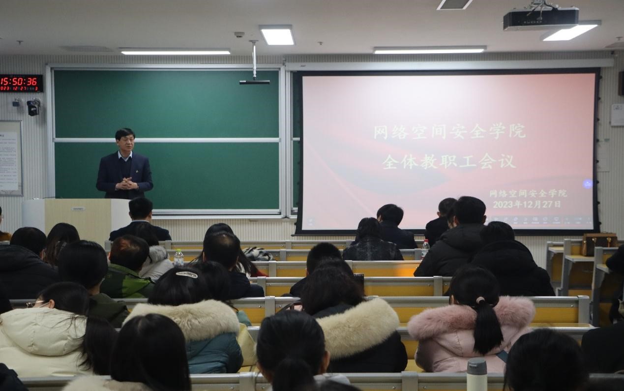 王茂励回顾了本学年学院在人才培养、学科建设、教学科研等方面取得的成果,对全体教师的工作表示了肯定和感谢。展望未来,机遇与挑战并存。王茂励对2024年学院重点工作进行部署,强调学院将持续推进“特色化育人模式”和“高水平科研工作”,并提出2点要求:一是教职工要发挥自身专业特色和优势,制定具体的计划,推动创新性教学和科研工作;二是要加强学风建设,积极推进学生就业工作,培养高素质全面发展网络人才,为建设一流网安学院砥砺奋进。