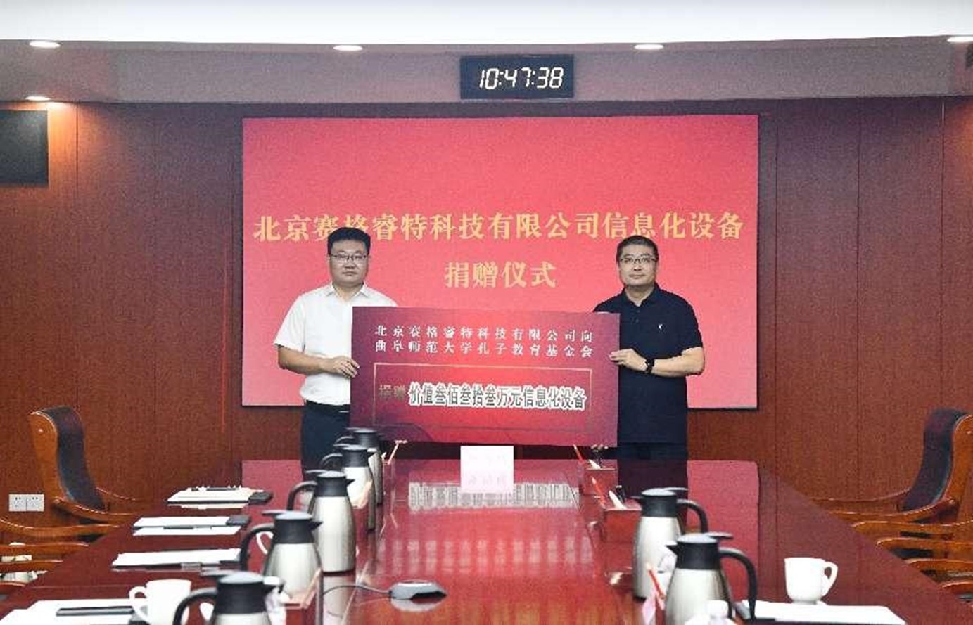 孔子教育基金会捐赠价值333万余元信息化设备,用于支持学校教育事业发展。曲阜师大数学系96级校友、北京赛格睿特科技有限公司总经理李国亮,曲阜师大党委常委、副校长、孔子教育基金会理事长纪洪涛出席仪式。