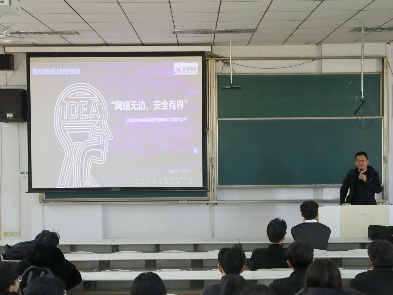 在讲座活动中,张广庆经理以国际网络安全事件为切入点,深入剖析网络安全对国家战略安全的重要性,并围绕“网络靶场”“网络空间部队人才培养计划”等话题,阐述了国家在数字化防御领域的布局。他结合2024年网络安全全景图及企业岗位需求变化,重点分析了AI与网络安全融合趋势,强调学生需以企业技能标准为导向,强化自主学习能力,提升攻防实践、安全运维等核心技能。在互动环节,同学们踊跃提问,张经理耐心答疑解惑,现场气氛热烈。