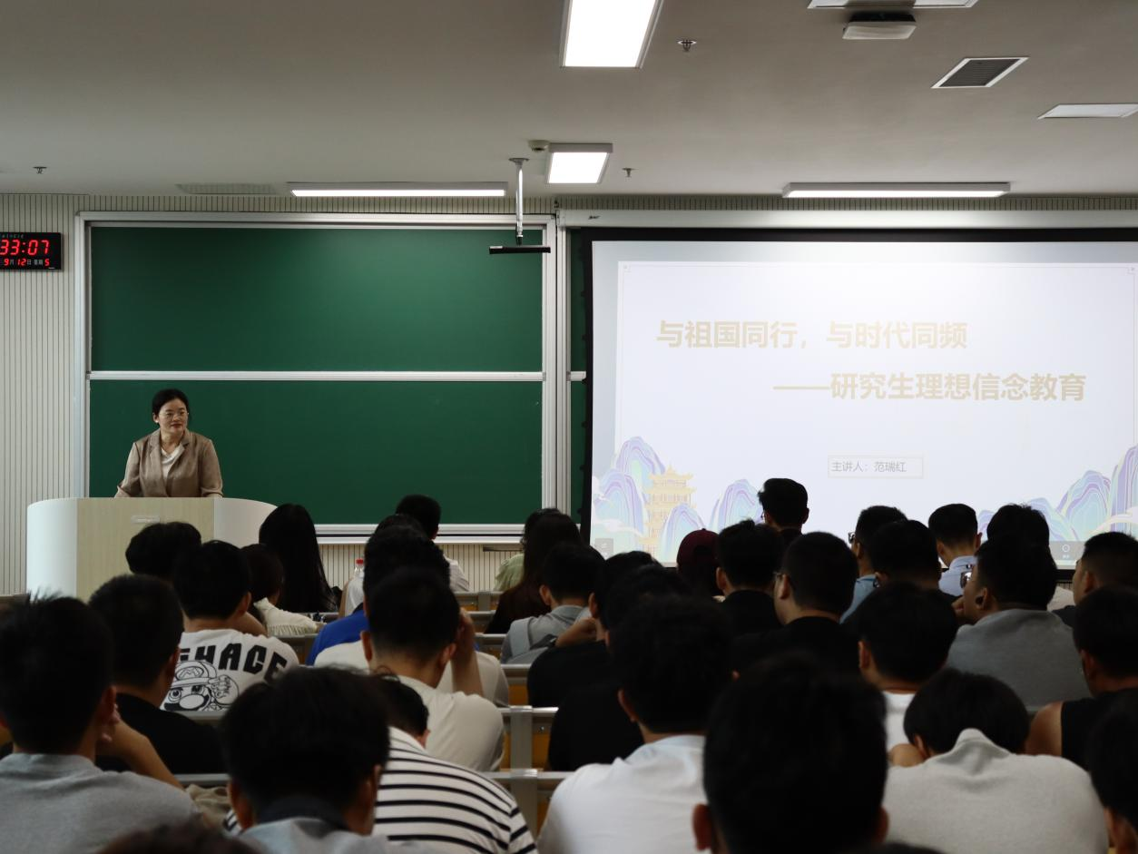 2025级研究生理想信念主题教育于格物楼B322教室开展。学院党委副书记范瑞红主持会议,研究生教学秘书曹腾,研究生辅导员赵兴卯,辅导员相青出席会议,学院2025级全体研究生参加会议。