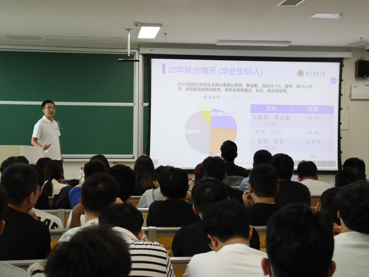 曹腾通过分享往年毕业生去向数据与典型案例,为新生们提供了有力的参考。数据显示,学院毕业生们在继续深造、进入公共部门、投身重点行业以及创新创业等方面均展现出良好的发展态势。无论是选择读博深耕学术,还是考公服务社会,亦或在行业中施展才华,都体现出多样的发展路径。他指出,只有在学习阶段做好长远规划、明确目标方向,才能在毕业时拥有理想的归宿和更广阔的未来。