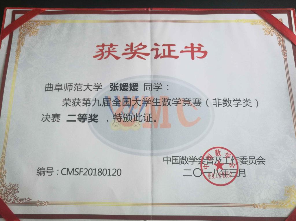 全国大学生数学竞赛分为数学专业组和非数学专业组,旨在通过竞赛活动,激励大学生学习数学的兴趣,进一步推动高等学校数学课程的改革和建设,提高大学数学课程的教学水平,发现和选拔数学创新人才。在预赛中,张媛媛取得山东赛区一等奖(非数学类),获得参加全国决赛资格。决赛后,张媛媛表示,此次比赛时间战线长,内容多,试题难,和自己研究生考试时间发生冲突。既要准备比赛又要考研学习,如何协调二者的关系,一度让自己焦虑。是学院领导和指导老师的不断鼓励,在学习、生活各方面给予悉心指导、关照,给了自己信心和力量,一步步坚持下来,才取得今天的成绩。据悉,张媛媛也顺利通过研究生笔试、面试,被哈尔滨工业大学计算机科学技术专业录取。