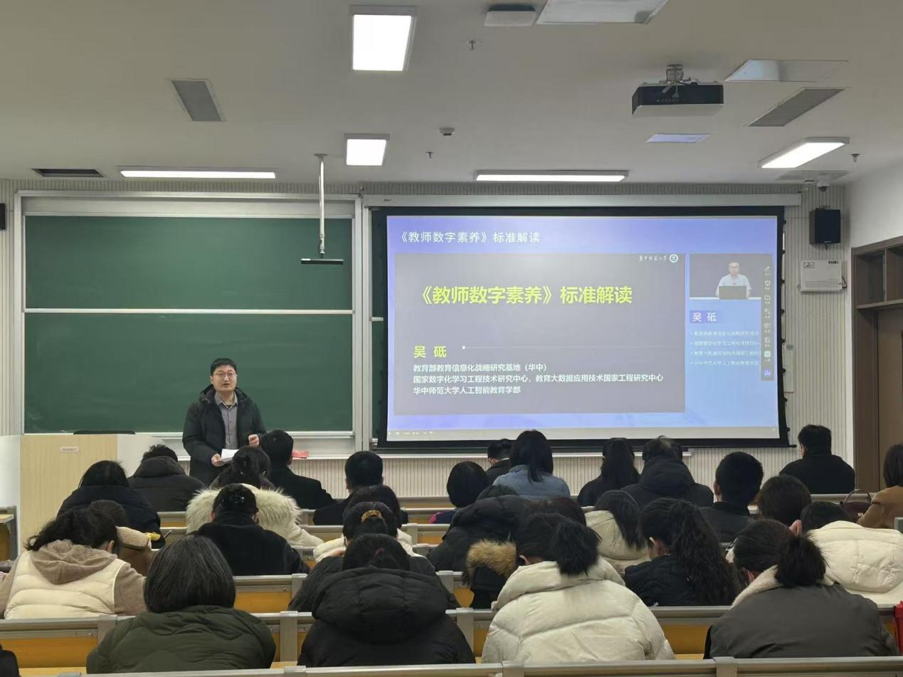 会议伊始,王茂励深入剖析了教师在科研创新中的核心价值,强调"教师不仅是知识的传授者,更应成为科研攻关的领航员",要求全体教师“以深厚的学术造诣指导学生把握研究方向”、“通过规范的科研训练培养学生创新能力”、“以团队协作模式带动青年学者快速成长”三个方面发挥示范引领作用。随后,马旭阐述了数字化转型背景下教育教学改革的实施路径:一方面要加快智慧教育基础设施建设;另一方面要创新教学范式,鼓励教师运用大数据分析学情、人工智能辅助备课、虚拟现实创设教学场景。最后,全体与会人员观看培训视频《〈教师数字素养〉标准解读》,深入了解教育教学技术的理念与方法。